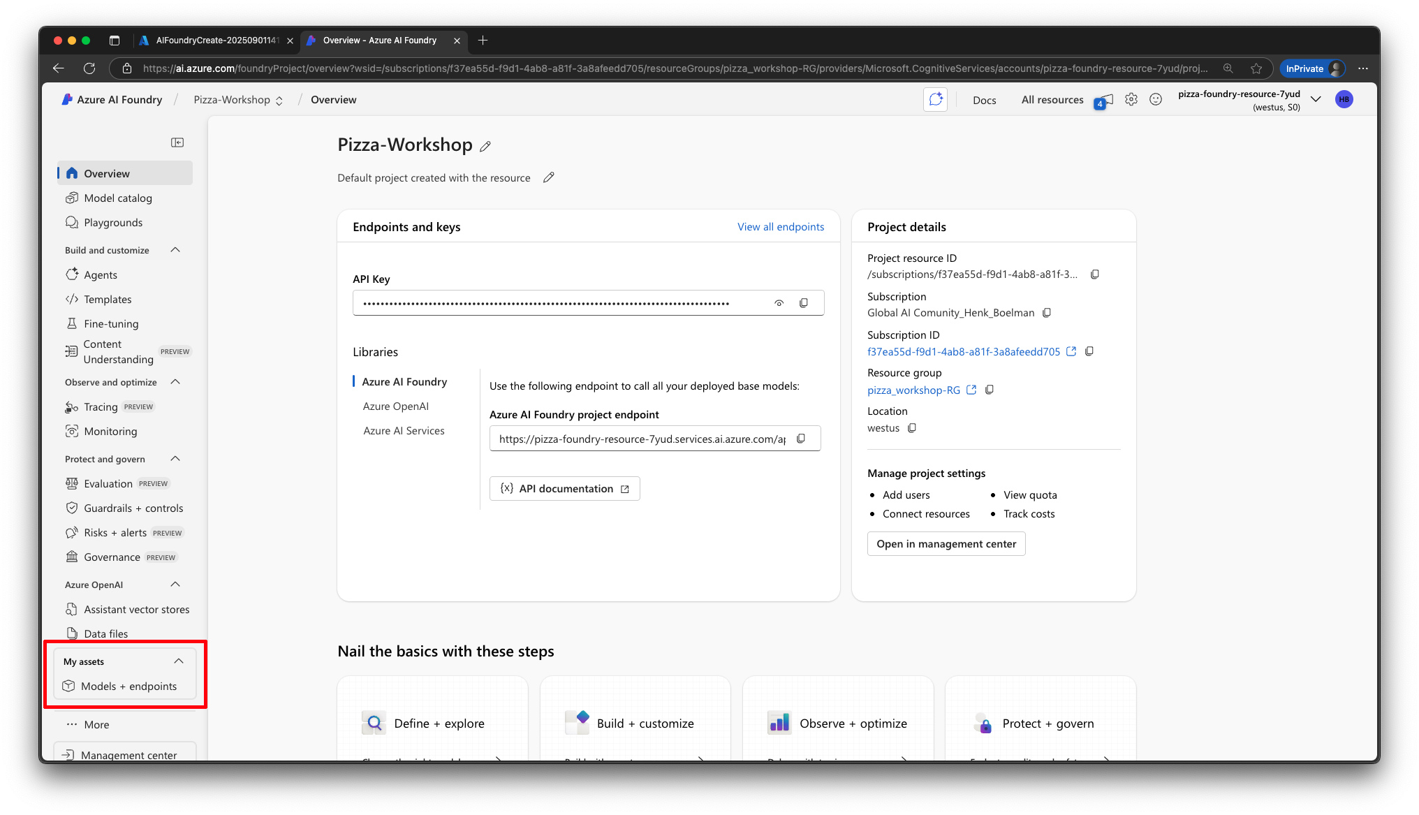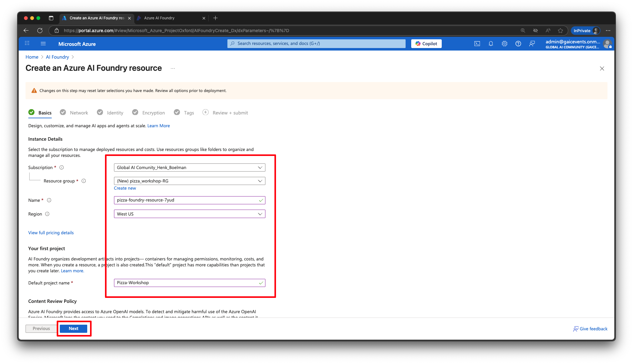 Fill in the form with the following values, then click Next:Field Value Subscription: Select the subscription provided for this workshop Resource group: Click Create newand give your resource group a descriptive name, e.g.pizza_workshop-RGName: Enter a unique name, e.g. pizza-foundry-resource-7yudRegion: Select West US (⚠️ Do not select another region) Project Name: Pizza-Workshop